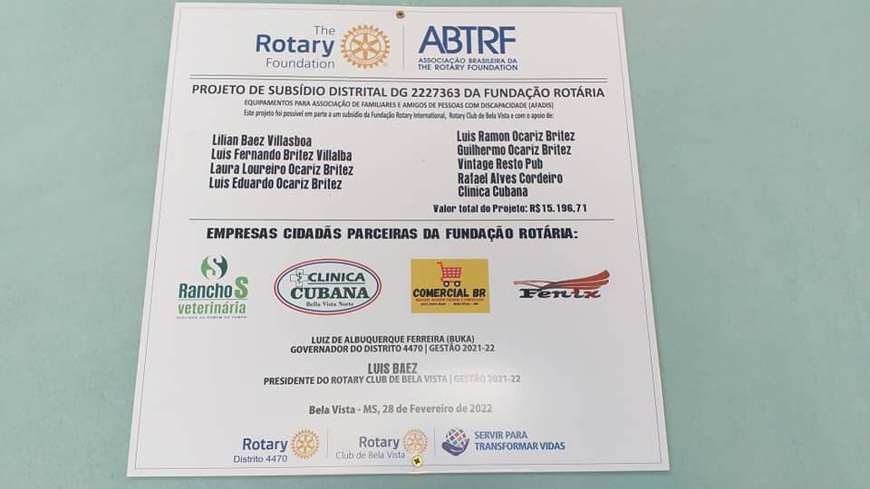 Na manhã de segunda-feira 28 de fevereiro, o Rotary Clube de Bela Vista realizou a entrega de equipamentos e materiais para a sala de Fisioterapia da AFADIS de Bella Vista Norte no valor de R$15.196,71, através do Projeto de Subsídio Distrital n.º DG 2227363 ano rotário 2021/22.